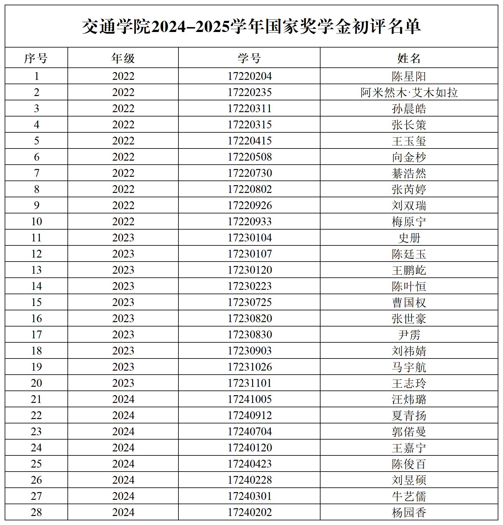 国家奖学金初评结果。现将结果公示如下(按年级排序):