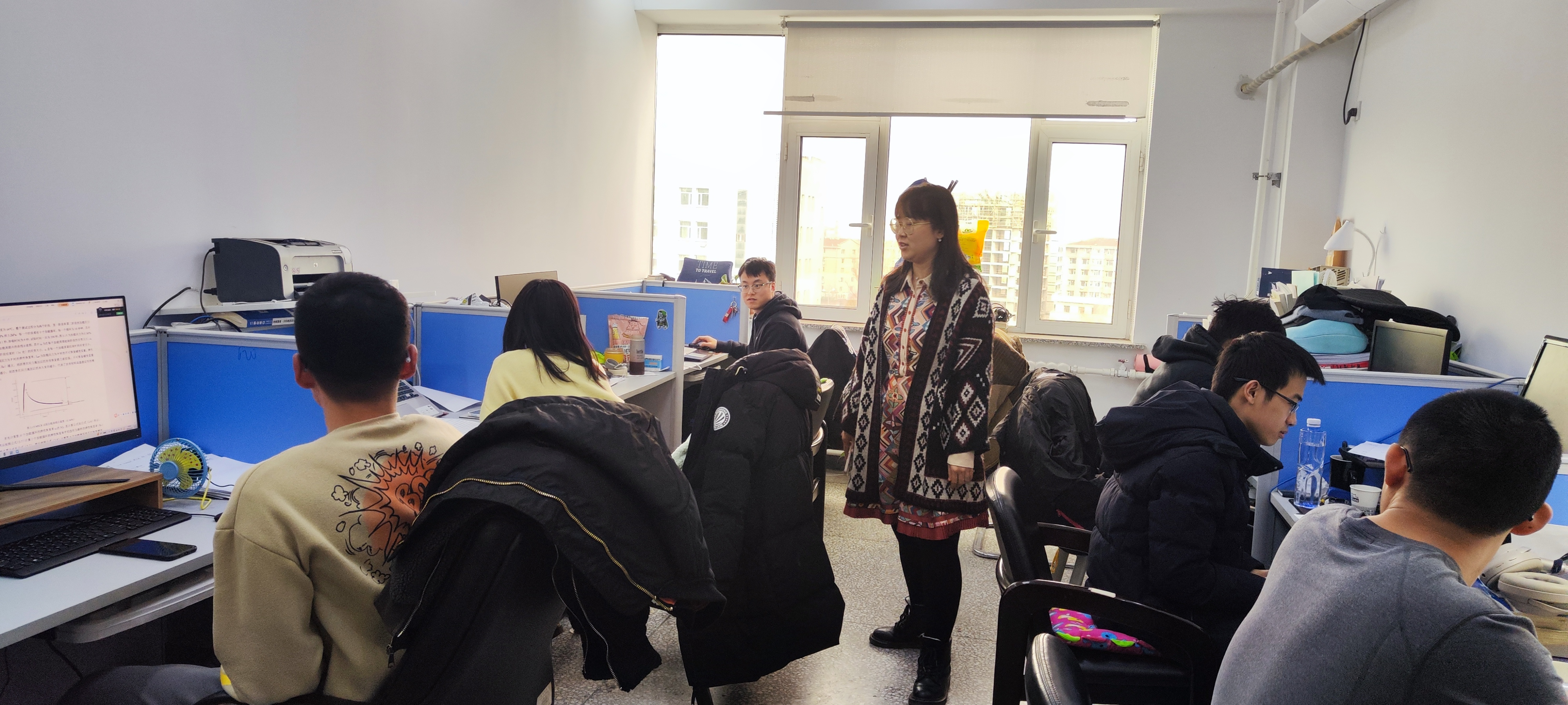 走访过程中,孙超老师与同学们进行亲切交谈,详细了解大家在假期的科研任务、身体健康情况、返校后思想动态、学习生活以及目前遇到的困难,并给予有效建议。孙老师在交流中欢迎大家有问题随时沟通。同时提醒同学们注意工作室用电安全,养成良好卫生习惯,营造安全舒适环境。孙超老师还勉励大家尽快调整学习状态,在新学期做好学习规划,努力增长知识、锻炼本领,以更加积极向上的精神面貌迎接新学期挑战。